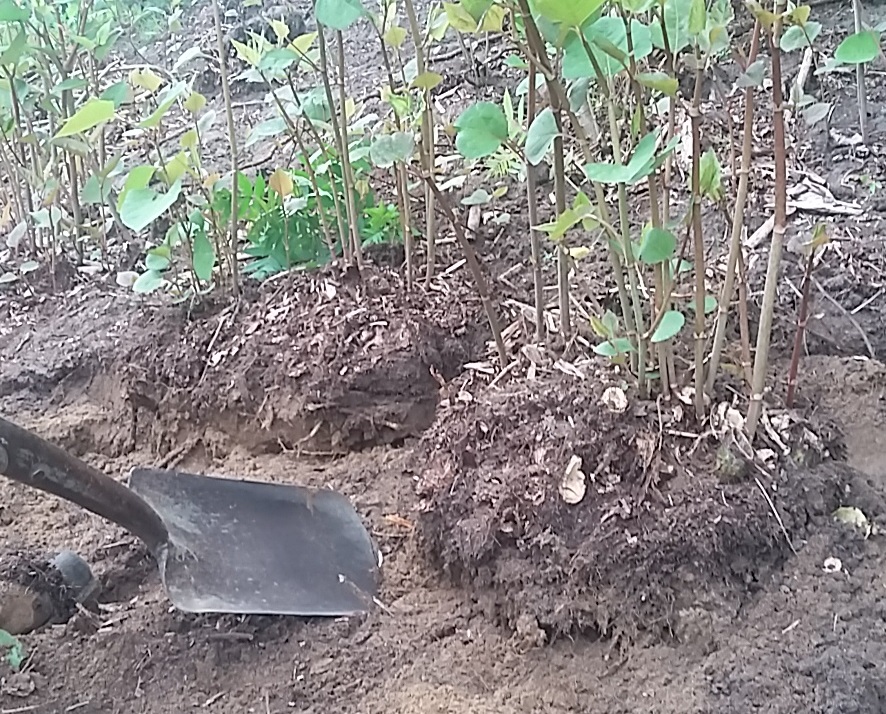 Étape 2 : Excavation des rhizomes mécaniquement ou manuellement. Aplanissement du terrain et retrait des pierres, des petites branches et des pousses pouvant percer une géomembrane. Mise en sacs étanches des résidus végétaux qui seront envoyés au site d’enfouissement. (Fiche d’explication de la méthode – English version)
