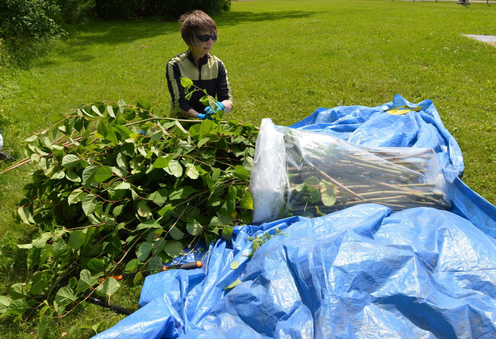 Étape 1 : Coupe des tiges aériennes en dessous du premier nœud. Mise en sacs étanches des résidus de coupe qui seront déposés au site d’enfouissement. (Fiche d’explication de la méthode – English version)