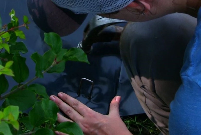 Étape 3 : Installation d’une géomembrane maintenue au moyen de piquets en U ou de pierres lourdes. La membrane doit dépasser la colonie d’au moins 2 mètres de chaque côté. Pour une efficacité maximale, la membrane devrait être laissée en place un minimum de 8 ans. (Fiche d’explication de la méthode – English version)