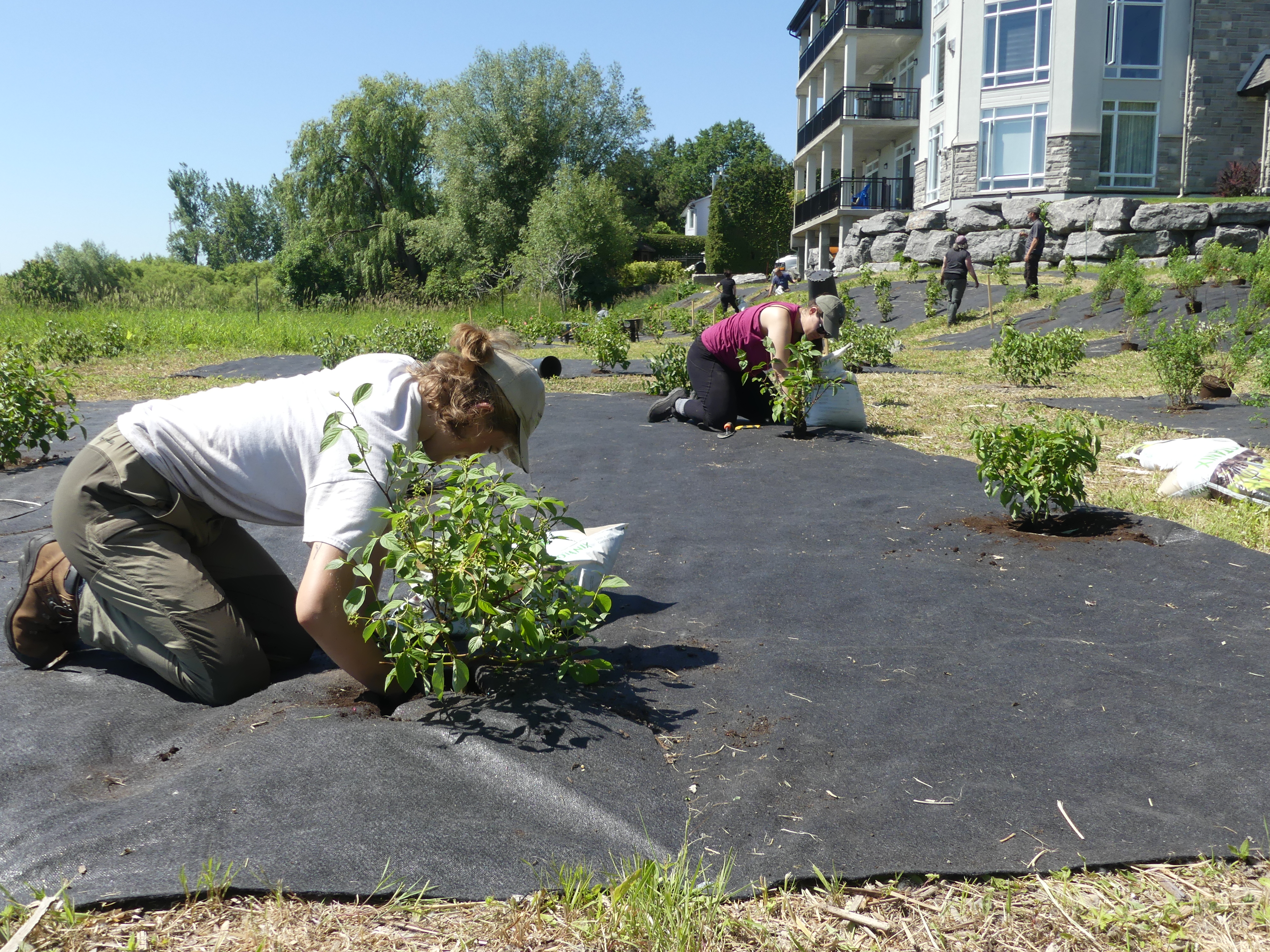 Cet été, grâce à une subvention de l’ordre de 14 700$ accordée par le Fonds d’Action Saint-Laurent et l’aide des copropriétaires des condos Le Flambeau, l’équipe du Comité ZIP des Seigneuries était prête à passer à la phase suivante du contrôle de cette plante envahissante. Le roseau étant beaucoup plus clairsemé, il était temps de le couvrir d’une grande membrane en géotextile. C’est en début juin, après une coupe, que nous avons posé la toile. Cela permet d’étouffer les plants survivants qui n’auront plus accès à la lumière. Pour nous assurer d’une bonne succession végétale, nous avons planté des arbustes indigènes qui resteront sur place lorsque la toile sera retirée dans quelques années. Pour rendre le paysage agréable pour les riverains, il a été décidé de planter des arbustes ayant une belle floraison. La ronce odorante, le céphalanthe occidental, la spirée tomenteuse, la spirée à large feuille et le cornouiller stolonifère ont leur place derrière les condos Le Flambeau depuis le 17 juin.