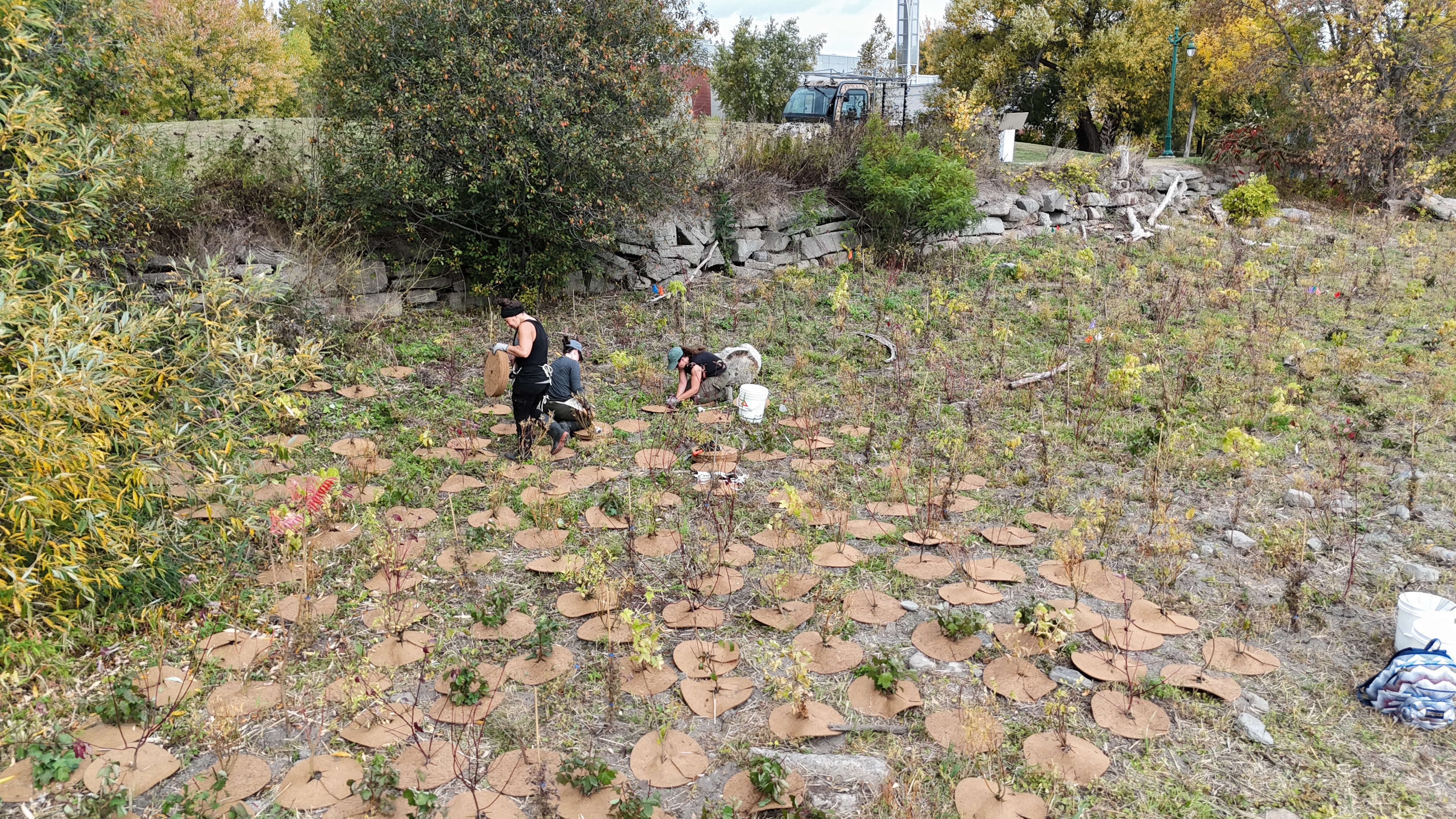 Puisque la plupart des mélanges de semences de milieux humides requièrent une stratification, c’est-à-dire une période d’exposition au froid pour germer, et par soucis d’implanter une bonne biodiversité incluant des plantes à fleurs propres au milieu, nous avons choisi de planter des îlots de plantes herbacées. Ainsi, 2 800 plantules herbacées (10 espèces indigènes) ont été installées sur environ 550 m².
