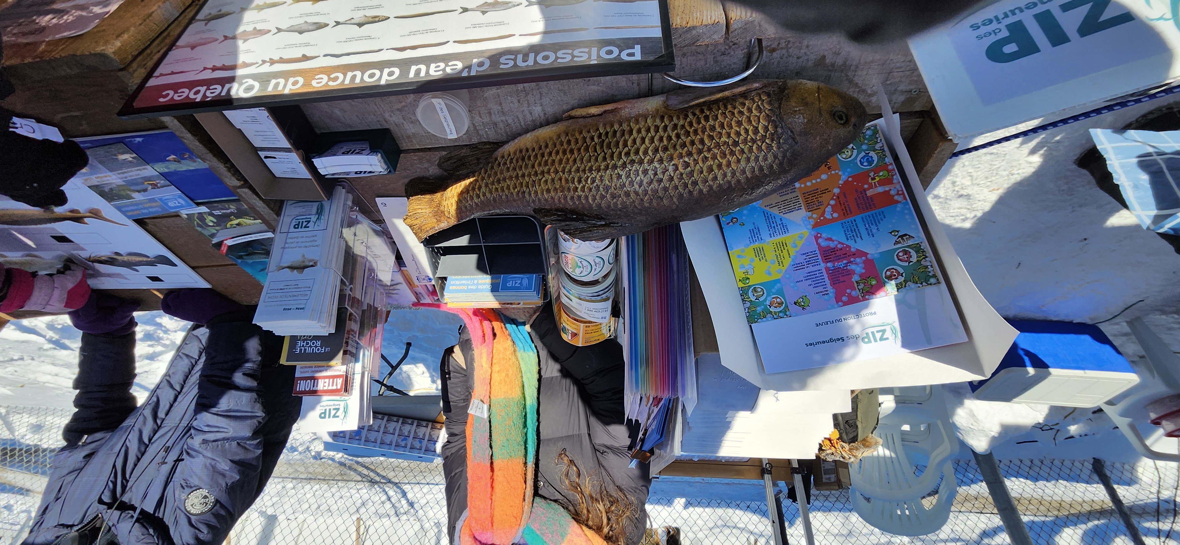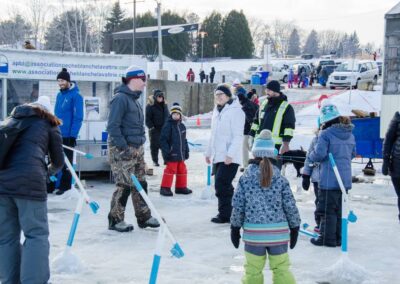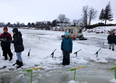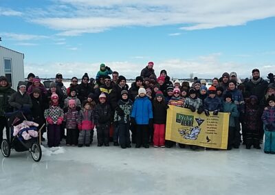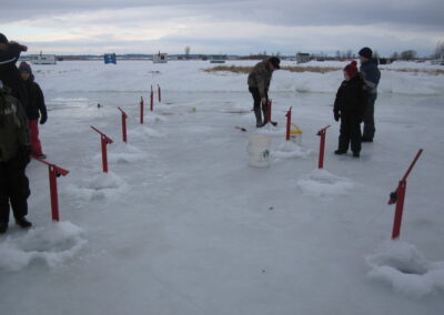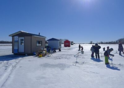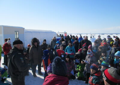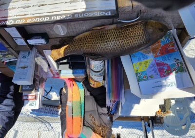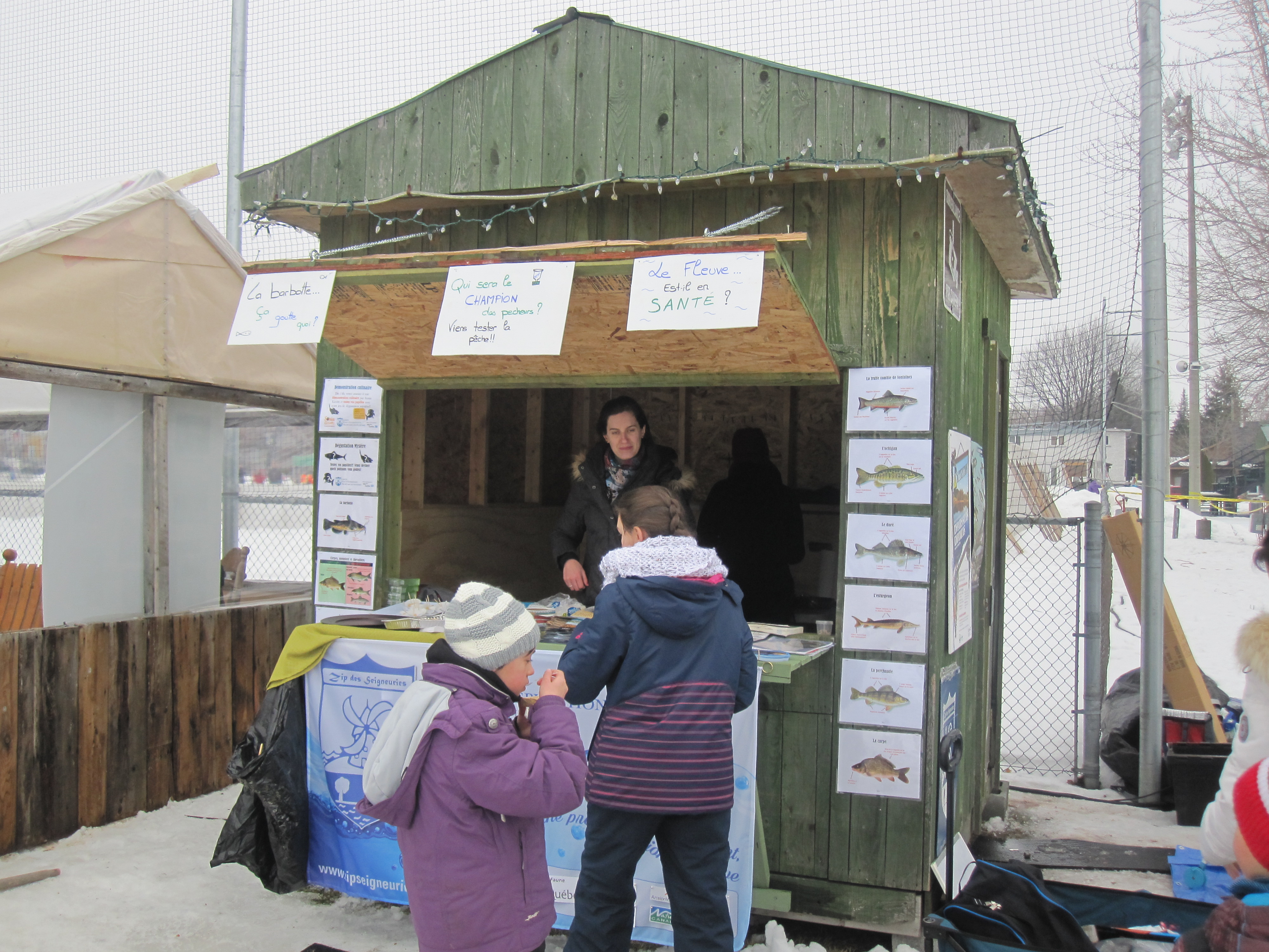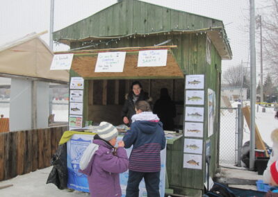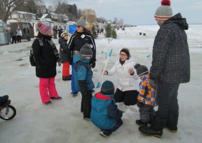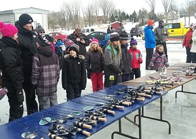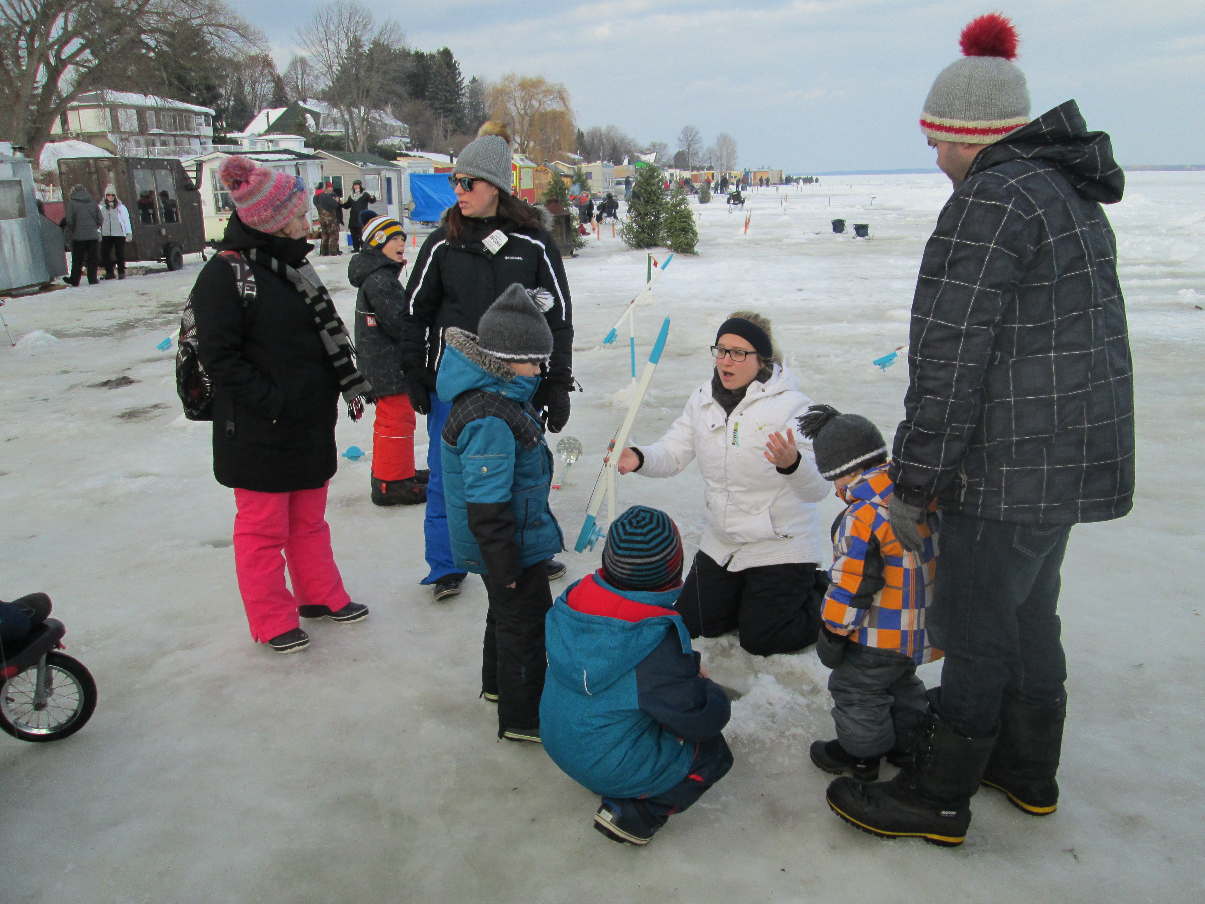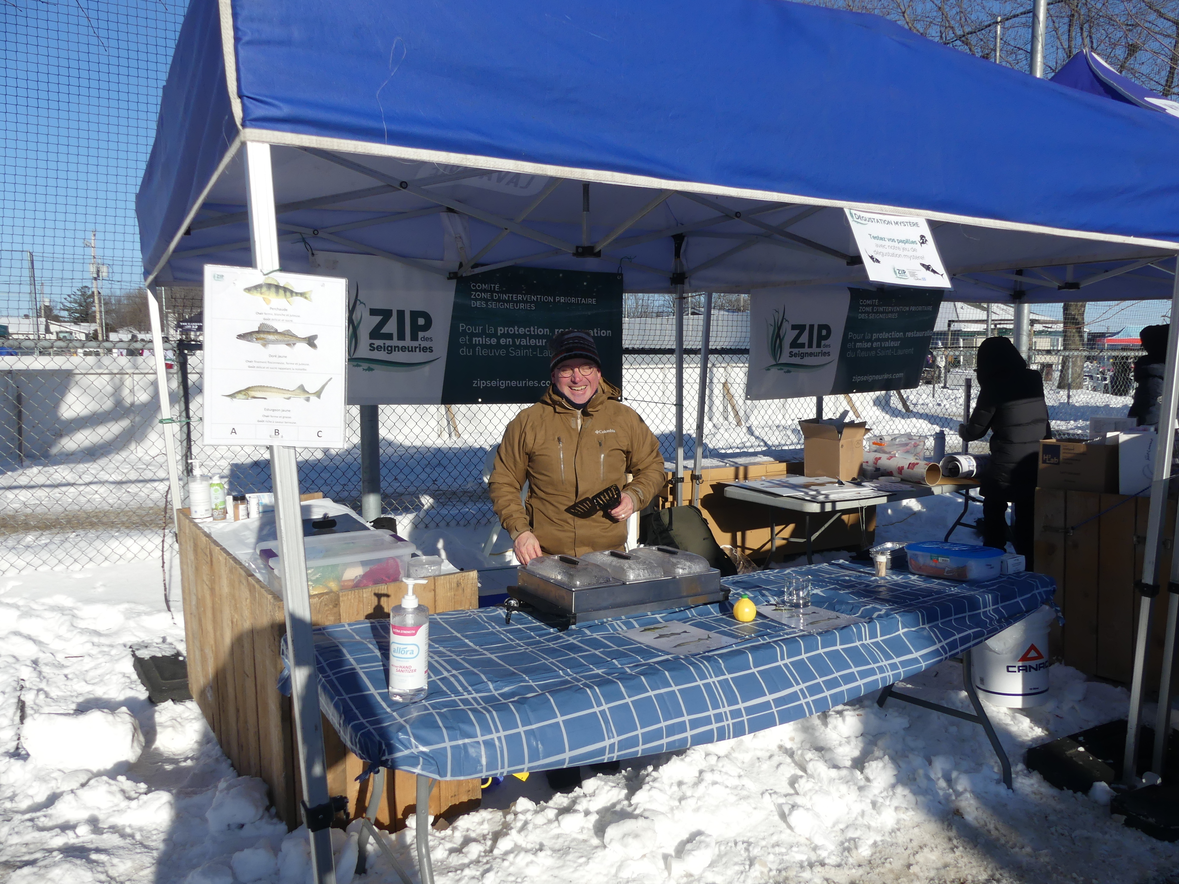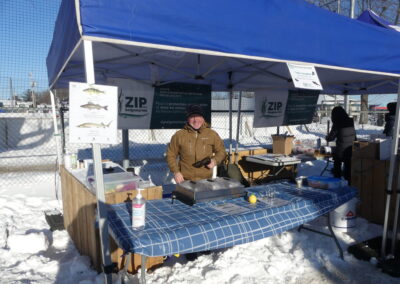 Dans le cadre de notre mission de protection et de mise en valeur du Saint-Laurent, nous faisons la promotion de la pêche blanche comme une activité écoresponsable et accessible à tous. Chaque hiver, nous participons à des événements grand public, en collaboration avec les municipalités de notre territoire, notamment à Lavaltrie lors de la Féérie d’hiver. Nos kiosques permettent aux visiteurs de s’initier aux techniques de pêche sur glace, de découvrir les bonnes pratiques pour une pêche durable, d’en apprendre davantage sur les espèces du fleuve et même d’y goûter grâce aux dégustations offertes.