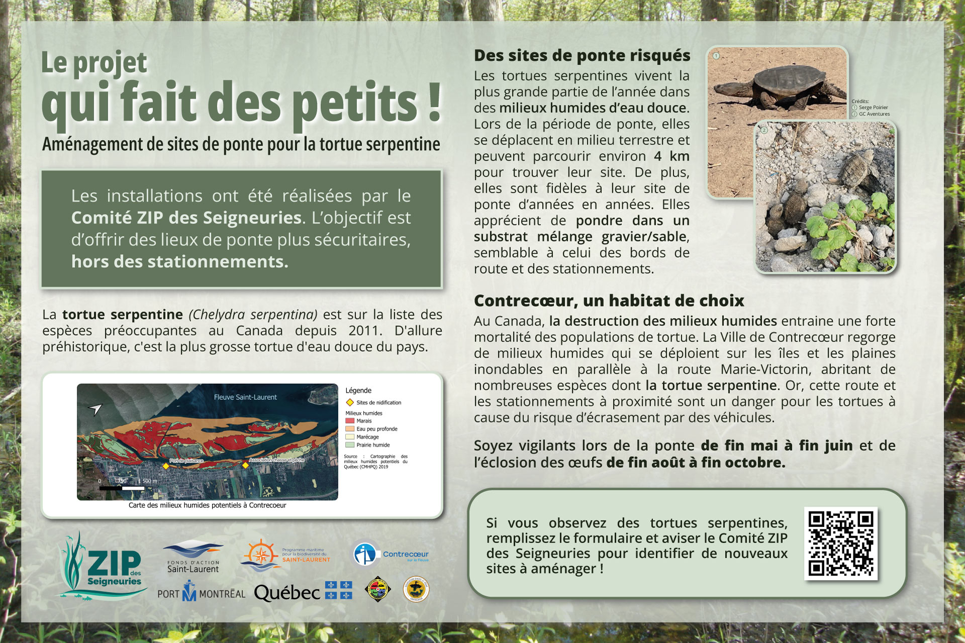 Le projet, en collaboration avec la Ville de Contrecœur, le Port de plaisance ainsi que Chasse et Pêche Contrecœur vise à aménager des sites favorables et assurant une protection pour la nidification de la tortue serpentine.