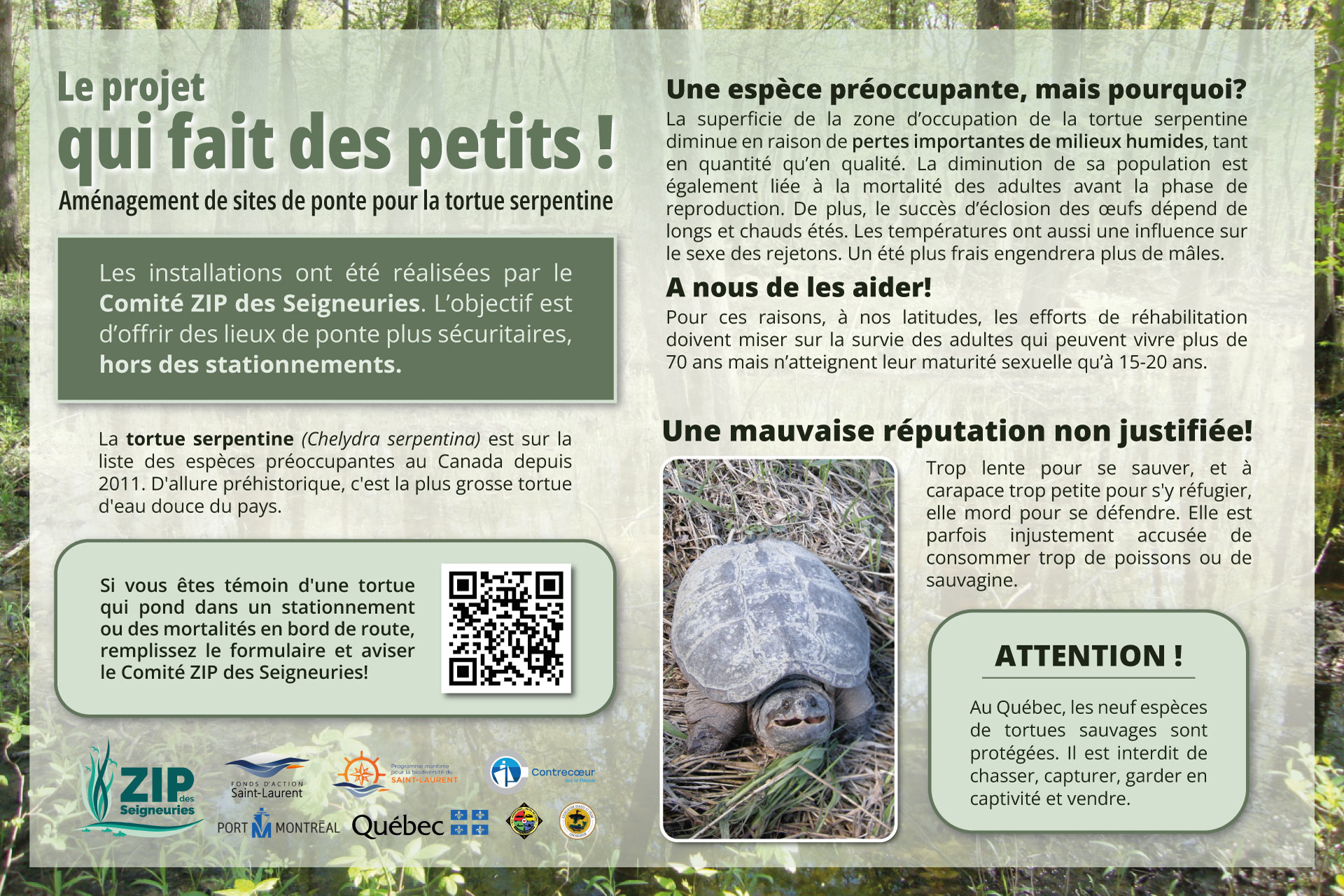 Un formulaire permet de recueillir les observations de tortues serpentines (mortalité proche de routes, nidifications dans des espaces non adéquat, etc.) pour identifier de potentiels nouveaux sites à aménager.